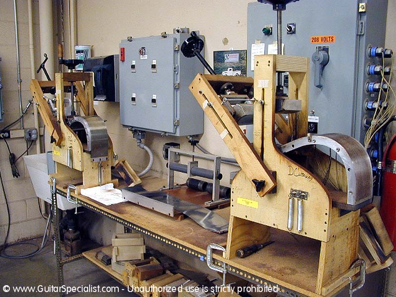 Here is a side bending machine. The side wood is obviously cut and "thicknessed" to the proper size in the milling room. Here it is heated and then bent to shape on this machine. They have different molds for different models.