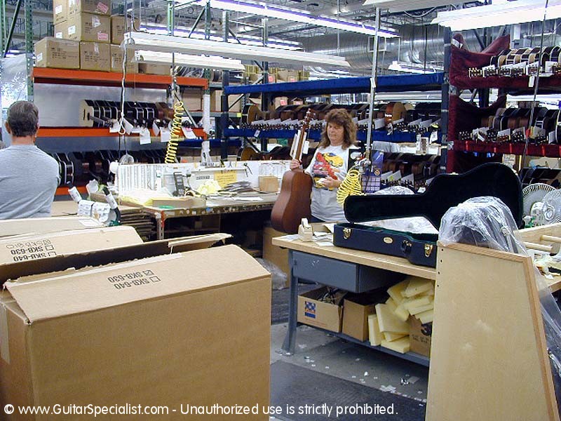 These folks are busy - very busy getting strings on guitars to fill orders.